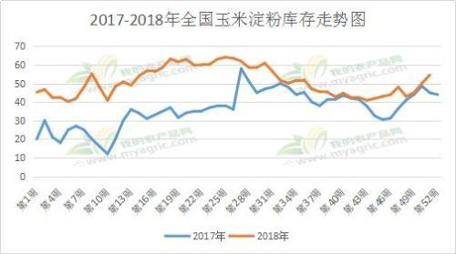 按照往年惯例进入12月份将是淀粉传统销售旺季,下游食品、造纸、化工等行业都将有所备货。从以上图表中也可以看出,近阶段全国淀粉开机率走势维持相对高位。根据我的农产品网对全国65家主要玉米淀粉厂家开停机情况调查数据显示,最近3个月以来,全国地区淀粉企业平均开机率维持在77%以上。但由于近期企业淀粉报价连续跌势行情,下游市场销售及采购心态远不及预期,企业库存连续性多周上涨,根据我的农产品网对全国65家主要玉米淀粉厂家的最新调查数据显示,2018年第51周,截止12月19日玉米淀粉企业淀粉库存总量54.5万吨,周环比增加4.5万吨,月环比增加6.4万吨,年同比增加9.5万吨。淀粉供需格局趋于宽松背景下,企业淀粉竞争压力只增不减。