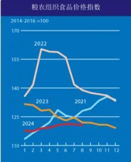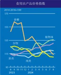9月6日,联合国粮农组织发布8月份全球食品价格指数。2024年8月平均为120.7点,较7月修订后的指数略有下降,其中食糖、肉类与谷物价格指数本月下跌,完全抵消了植物油与乳制品价格指数上涨的影响。与历史水平相比,8月的食品价格指数与上一年同期相比下跌了1.1%,较2022年3月160.3点的历史峰值则下跌了24.7 %。