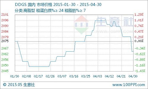 据生意社监测数据显示:4月国产DDGS价格小幅下滑,月初均价为2096元/吨(含税),月末均价为2065元/吨(含税),跌幅为1.48%。