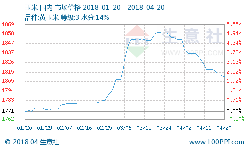 据生意社监测,本周国内玉米价格持续小幅下滑,周初3等黄玉米均价为1816.79元/吨,周末均价为1810.36元/吨,小幅下跌0.36%。