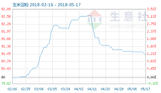 5月17日玉米淀粉商品指数为81.01,较昨日下降了0.06点,较周期内最高点102.71点(2015-07-20)下降了21.13%,较2017年03月13日最低点66.77点上涨了21.33%。(注:周期指2015-06-01至今)