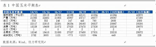 在新一季玉米产量大幅上升的背景下,玉米期货价格在年初达到了历史最高价格后,一路下滑至2500附近。9月中旬左右,主力2201合约给出了近期的最低价2429。不过在国庆节后,价格连续反弹,目前已经回到了2500元上方。市场上对于玉米的反弹行情反应较为激烈,反弹能否继续,甚至扭转阶段偏弱的走势?笔者将从整体供需角度做出分析。宏观方面:分析玉米的整体走势先要从宏观角度进行整体分析,首先亮明一下观点,21/22季,国内玉米的供需是平衡的,不存在供应缺口,具体分析如下:供应方面:今年针对玉米价格快速上涨,国家从政策上作出了调整,针对供应方面,主要体现在:1.加大玉米进口量。2.增加玉米的播种面积。具体预测(未来)数据及往年数据对比可以参考下方中国玉米平衡表。单从数据角度看,21年的玉米进口量以及新一季玉米的产量都是破纪录的。从品种角度来看,农产品价格如果发生重大的变化,一般都是供应端出现了变化,而需求方面的变化很少会引起价格大幅度的变化,玉米价格19-20年快速上涨也正是国内供应出现了缺口导致。