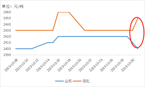 本周(10.28-10.31)山东地区玉米淀粉报价出现连续下调,现山东地区主流报价为2400-2430元/吨,较上周五下调20-30元。正当大家普遍看弱淀粉后市行情之时,今日河北地区淀粉报价出现普涨。今早邢台玉锋率先上调报价,河北地区其余企业跟涨,现河北地区主流报价为2450-2460元/吨,较上周五上调20-30元。河北涨山东跌,让人不禁想问玉米淀粉涨涨跌跌为哪般?后市走势究竟如何?