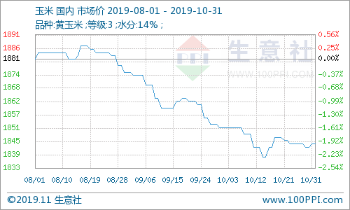 据生意社监测,10月份国内玉米价格小幅震荡下行,10月1日3等黄玉米均价为1851.43元/吨,10月31日均价为1844.29元/吨,小幅下跌0.39%。