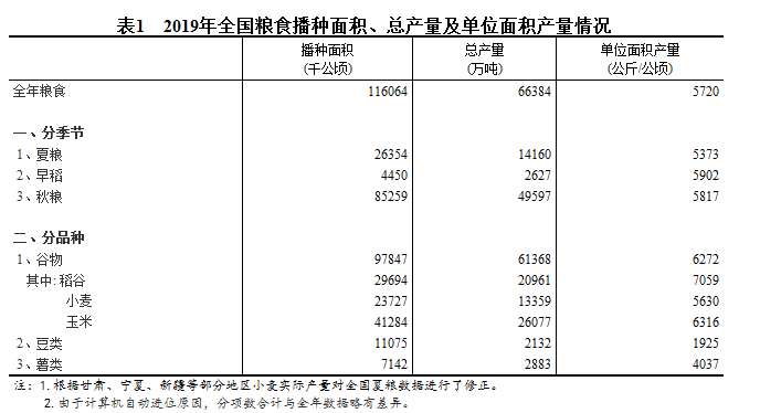 2019年全国粮食总产量66384万吨 同比增0.9%