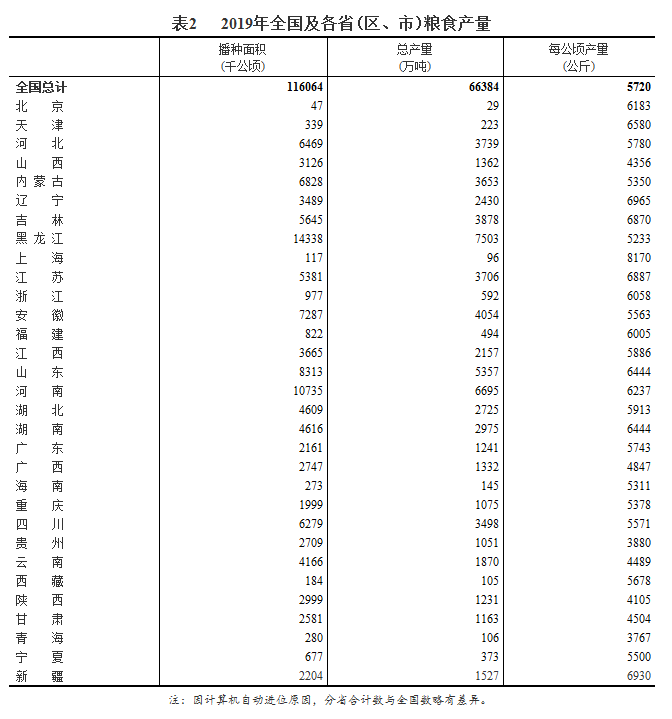 国家统计局在解读中指出,2019年全国粮食总产量66384万吨(13277亿斤),比2018年增加594万吨(119亿斤),增长0.9%,创历史最高水平。同时,2019年全国粮食播种面积17.41亿亩,比上年减少1462万亩,下降0.8%。