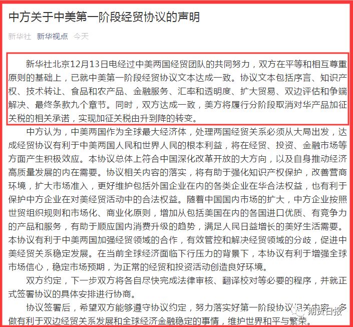 值得注意的是,美国总统特朗普作为发了一条推文,特朗普表示在达成第一阶段协议中“中国同意进行许多结构性的改革”,以及大幅购买美方的农产品,但是他说25%的美方关税将会保留,其余的将会是7.5%的税率,12月15日原本要加征的关税的确不会再实施。特朗普称下一阶段的谈判会立即开始,而不是等到2020年美国大选之后。