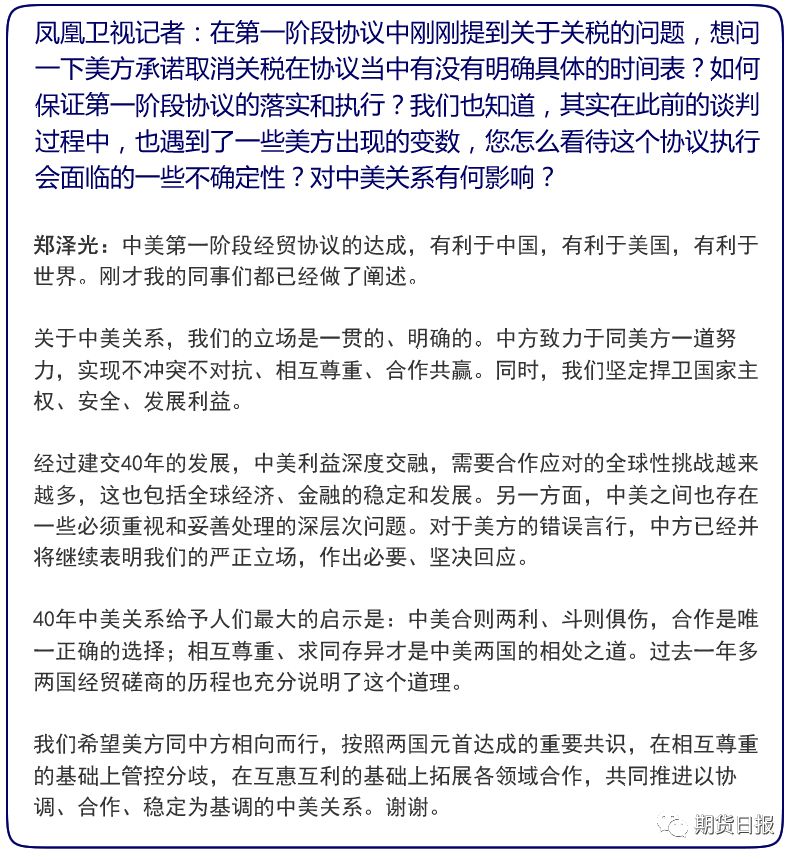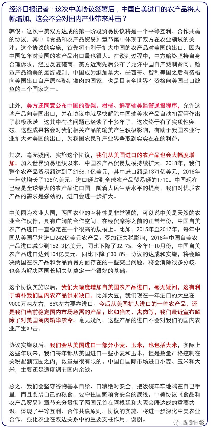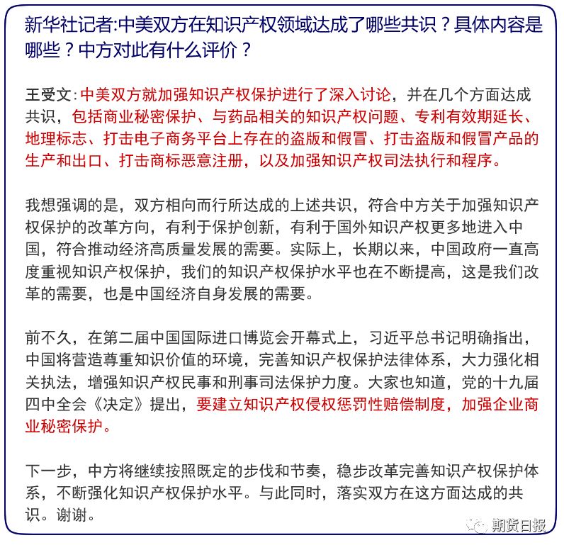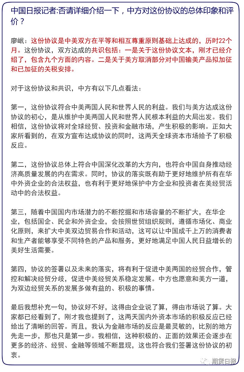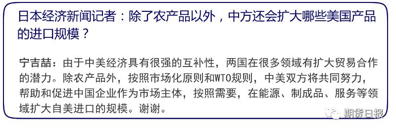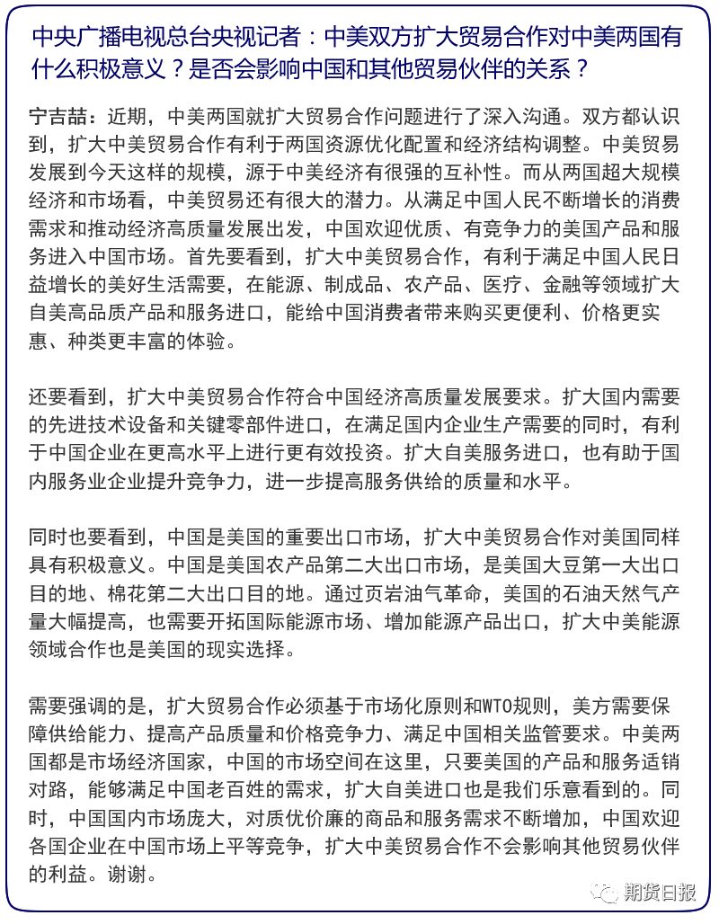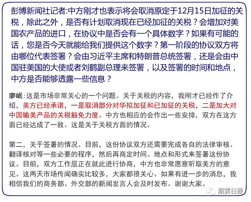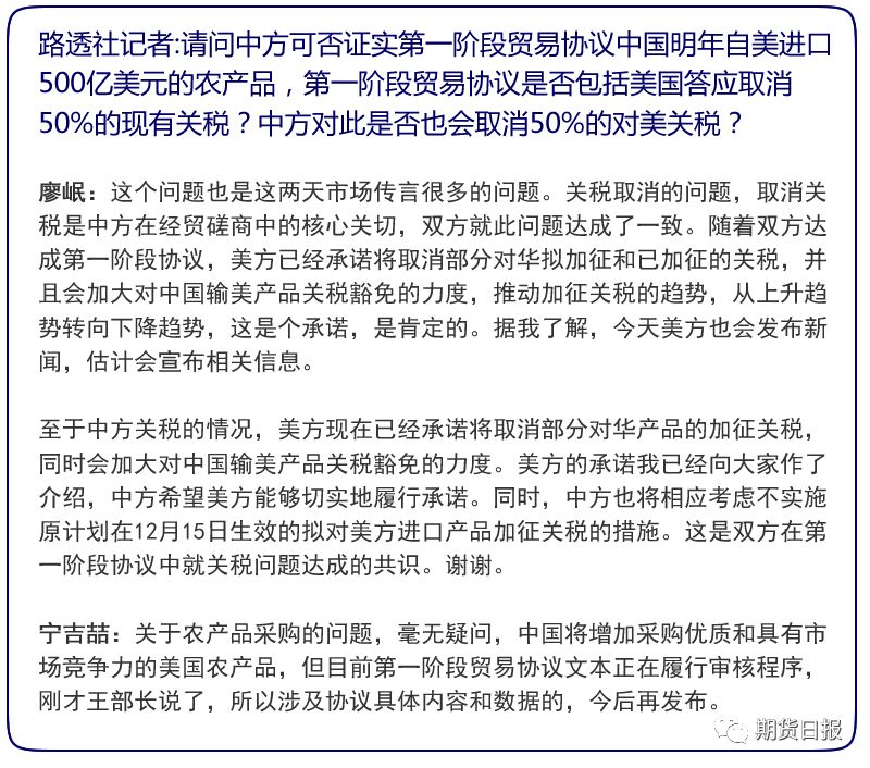 据人民日报,宁吉喆表示,毫无疑问,中国将增加采购优质和具有市场竞争力的美国农产品,但目前第一阶段贸易协议文本正在履行审核程序,刚才王部长说了,所以涉及协议具体内容和数据的,今后再发布。
