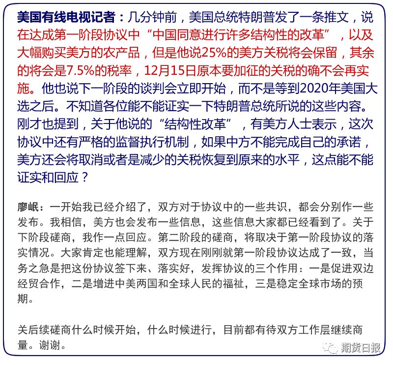 据人民日报,财政部副部长廖岷表示,关于下阶段磋商,我作一点回应。第二阶段的磋商,将取决于第一阶段协议的落实情况。大家肯定也能理解,双方现在刚刚就第一阶段协议达成了一致,当务之急是把这份协议签下来、落实好,发挥协议的三个作用:一是促进双边经贸合作,二是增进中美两国和全球人民的福祉,三是稳定全球市场的预期。有关后续磋商什么时候开始,什么时候进行,目前都有待双方工作层继续商量。