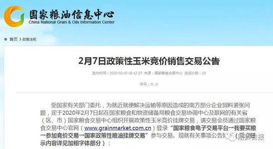 受疫情影响,当前国内玉米市场出现了运输不畅的发展态势,部分主销区市场玉米供应趋紧,一些饲料厂与养殖户生产原料出现短缺。在此关键时刻,受国家有关部门委托,为就近就便解决运输等原因造成的南方部分企业饲料紧张问题,国家粮食交易中心定于2020年2月7日起在国家粮食和物资储备局粮食交易协调中心及联网的有关省(区、市)国家粮食交易中心组织开展政策性玉米竞价挂牌交易。