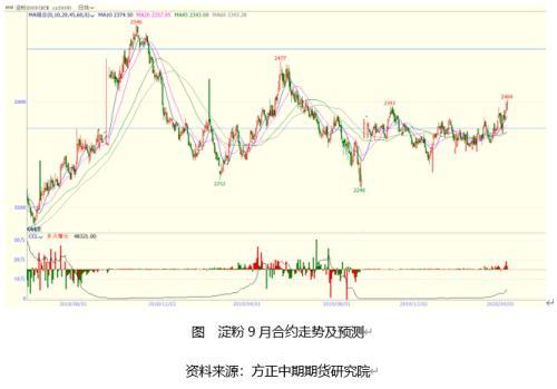 2、淀粉:现春节期间,国内淀粉行业开工率下降至35%左右,2月中下旬以后国内淀粉行业开工率迅速回升至70%上方。春节及节后公共卫生事件发酵期间,淀粉出库受限,国内淀粉行业库存大量积累,连创历史新高,3月下旬库存有所下降,但同比仍然高出6.85%,夏季是淀粉的消费旺季,随着淀粉库存的消化,淀粉价格预计维持坚挺,目前淀粉9月合约涨至2400元/吨,后市预计淀粉9月合约将在2350-2500元/吨区间震荡为主。操作上,目前淀粉库存较高,短期突破上涨预计乏力,5月份以后随着库存去化,预计大概率随玉米上涨为主。操作上可考虑于2350-2400元/吨买入为主。
