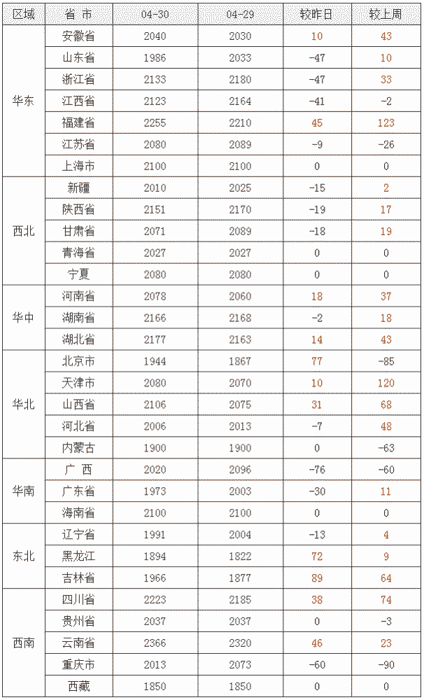 截至4月30日,全国玉米均价为2075元/吨,较昨日报价上涨3元/吨。玉米均价(15%水分)前五:云南省2366元/吨、福建省2255元/吨、四川省2223元/吨、湖北省2177元/吨、湖南省2166元/吨;玉米均价(15%水分)后五:西藏自治区1850元/吨、黑龙江省1894元/吨、内蒙古自治区1900元/吨、北京市1944元/吨、吉林省1966元/吨。
