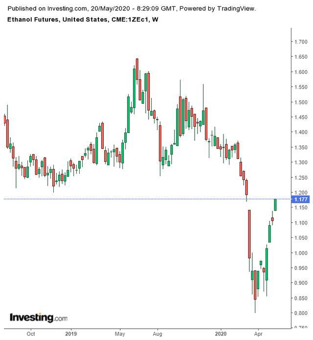 自从油价在4月28日触底以来,WTI原油已经累计上涨了约220%,突破每桶32美元的水平。相比之下,同期芝商所交易的乙醇期货仅上涨了25%。