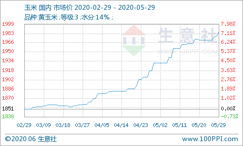 据生意社监测,5月国内玉米价格持续偏强运行,5月1日3等黄玉米均价为1931.43元/吨,5月29日均价为1985.71元/吨,上涨2.81%。