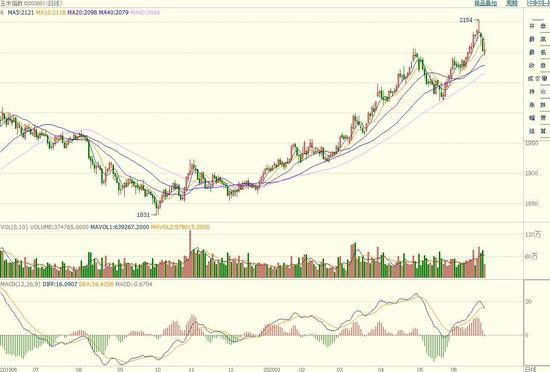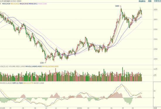 2020年上半年玉米期货指数震荡上行,支撑位不断抬升并创下2016年以来高位,MACD长短均线均运行于零轴上方,但红柱不断缩窄转绿,显示2154元/500千克高位存在一定压力,而下方2020元/500千克一线存在较强支撑,短期期价或回踩测试下方支撑情况。