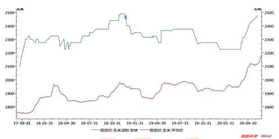 玉米现货平均价和吉林玉米淀粉价格走势图