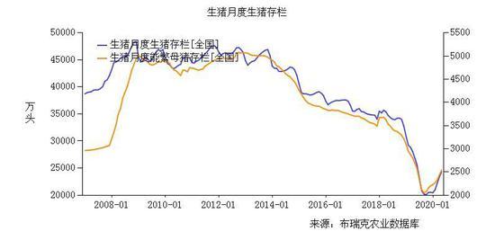 考虑到非洲猪瘟当前尚无有效疫苗且生猪感染致死率高的特点,防疫应属长期工作,生猪存栏恢复任务紧迫,随着2019年政府养殖补贴和政策鼓励,截至2020年5月全国生猪存栏数量报24330.4万头,连续5个月保持增长,同比去年26850.7万头降幅9.4%,全国能繁母猪存栏数量报2537.72万头,连续8个月保持增长,同比去年2690.95万头降幅5.7%。