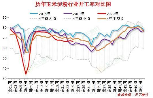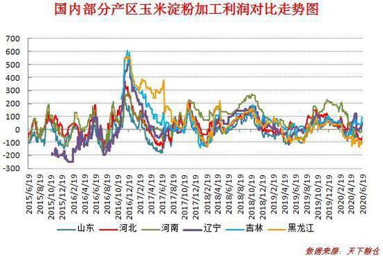 据天下粮仓跟踪,截止6月19日,山东地区加工利润亏损97.46元/吨,河北地区加工利润亏损54.5元/吨,黑龙江地区加工利润亏损94元/吨,吉林地区加工利润盈利96.5元/吨,辽宁地区利润盈利52元/吨,价格出现成本支撑型上涨;2020年第25周(6月13日-6月19日),据天下粮仓对东北、山东、河北等地区的82家淀粉企业进行调查,有51家处于开机状态(其中20家未满负荷生产),其余31家停机。本周本周淀粉行业开机率为63.28%,较上周63.42%降0.14%个百分点;而较去年同期61.88%增1.4个百分比;玉米原料成本挤占下游企业利润,导致部分企业开机率整体窄幅走弱,处于历史同期中等偏低水平。
