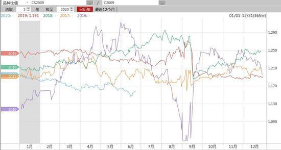 对比淀粉09合约和玉米09合约期价比值关系走势图,随着下半年生猪存栏逐渐恢复,玉米饲料需求环比继续好转,而玉米深加工需求整体增幅空间相对有限,在玉米供应进入紧平衡而生猪养殖利润相对可观的背景下,预计淀粉与玉米主力合约期价比值关系或延续弱势,可以关注空淀粉而多玉米的跨品种套利操作。