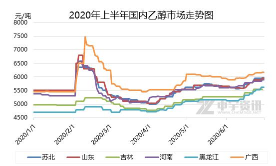 2020年上半年,受新冠肺炎疫情防控的影响,国内多个省市地区纷纷采取延长假期及复工时间等措施来控制疫情发展,我国经济活动骤然降温,化工企业的正常运行也受到一定影响,但由于75%消毒酒精的能杀死病毒的特殊性,乙醇市场走势整体向好。