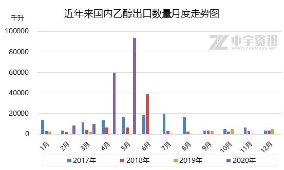 根据海关统计,截止2020年5月份,本年度我国累计出口乙醇418099.836千升,其中未改性乙醇160507.436千升,改性乙醇257592.4千升。