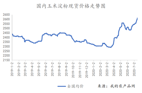 随着现货市场价格高歌猛进,玉米价格跟随成本快速上涨,屡破近年来价格高位。据我的农产品网监测显示,截至7月16日,玉米深加工企业玉米收购价格月环比分别上涨80-140元,折算淀粉成本,相当于淀粉成本增加100-190元/吨左右。由于原料成本增加,导致企业产品提价意愿持续上升。目前华北地区企业玉米淀粉出厂主流报价至2650-2750元/吨,部分企业报涨至2790元/吨;东北地区玉米淀粉出厂主流报价至2500-2600元/吨,普遍有100-150元/吨涨幅,且玉米淀粉目前价格已到近年来价格高点。