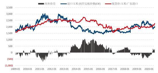 图:进口玉米内外价差(单位:元/吨)