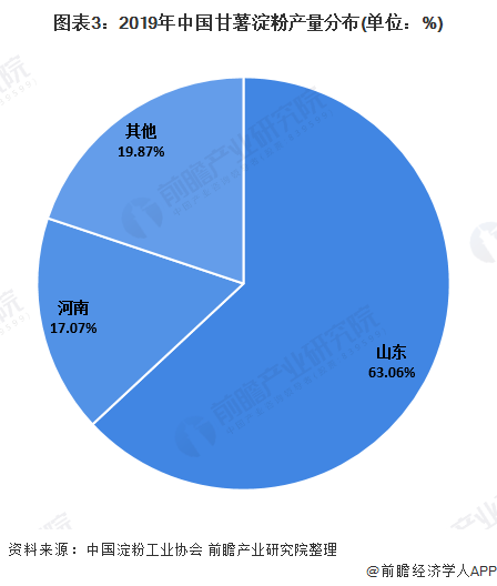 从地区分布看,甘薯淀粉加工企业主要分布在北方及长江中下游薯区,其中位于山东、河南两省的企业甘薯淀粉产量占此次统计总产量的80%左右。2019年山东和河南甘薯淀粉产量分别为14.41万吨和3.90万吨,分别占总产量的63.06%和17.07%。