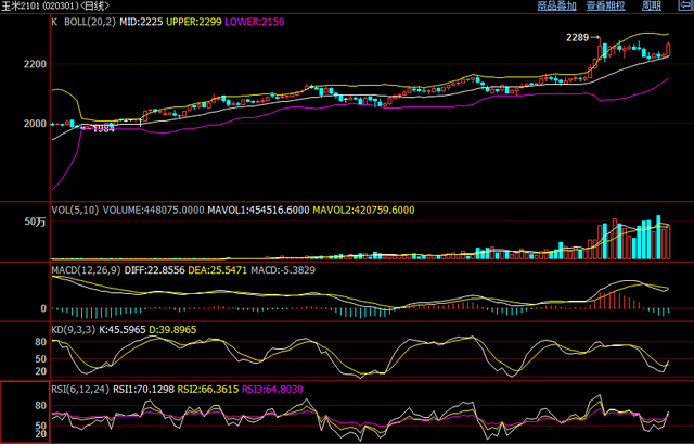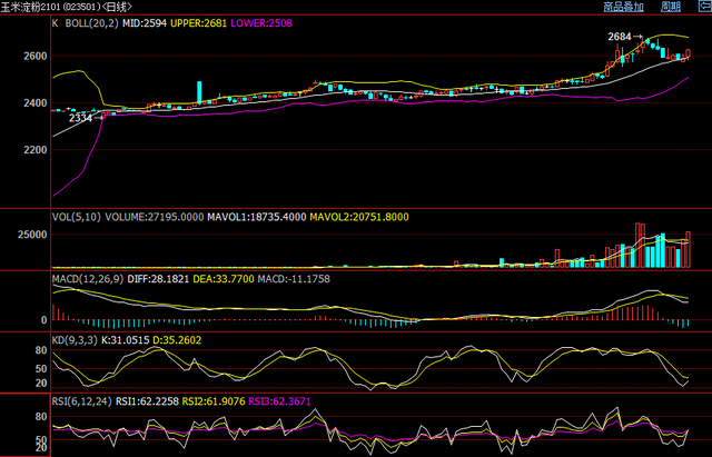 玉米1月合约上涨2元,涨幅0.09%,收盘价2228元/吨。日线图显示,夜盘22:00,K线在布林线中轨线获得支撑。2小时图表显示,MACD指标即将金叉,KD指标上扬,K线在MA60附近获得支撑。