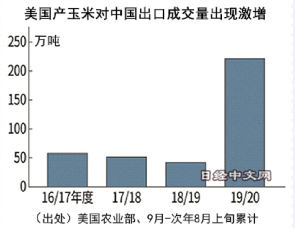 据美国农业部的数据显示,中国签订合同的美国产玉米购买量2019年9月~2020年8月上旬累计约为221万吨。这一数字是上年同期的5倍以上。与贸易摩擦前的2017~2018年度同一时期相比也增至4倍多。