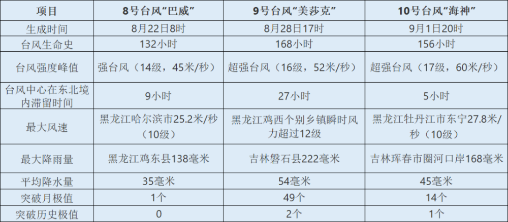 我们来看看具体情况,过去半个月内(8月26日至9月8日),东北地区连续遭受第8号台风“巴威”、第9号台风“美莎克”和第10号台风“海神”影响,为有气象记录以来首次,比常年全年影响东北地区台风个数(1.2个)偏多1.8个。