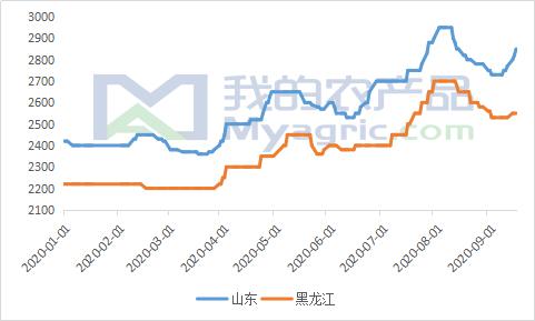 首先从价格来看,受台风天气影响,东北地区新季玉米出现不同程度倒伏,减产炒作愈演愈烈,上周一(9月7日)玉米盘面价格大幅上涨带动玉米淀粉期货价格上行,华北地区个别企业通过期现结合的方式大大减轻了现货库存压力,逐步开始拉涨淀粉现货价格,由此淀粉展开上涨模式。截止17日当日,华北地区玉米淀粉主流报价涨至2820-2870元/吨,较月初上涨100元/吨左右。