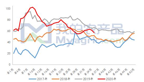 图一:2020年全国玉米淀粉价格走势图 此轮淀粉价格上涨主要受淀粉市场阶段性供需紧张所影响,从供应方面来看,不少淀粉企业减产限产导致玉米淀粉供应量减少。河北地区广玉停机、玉锋半产;山东地区恒仁今日减料至3500吨玉米,临清金玉米停机一天等等,玉米淀粉阶段性供应减少。另一方面,恰逢中秋国庆双节备货期,食品,面粉,批发等下游行业需求量明显恢复,淀粉新签订单量明显提升。叠加涨价影响,下游提货积极性较高,淀粉走货速度明显加快。据数据调研显示,本周淀粉行业库存下降明显,2020年第38周,截止9月2日玉米淀粉企业淀粉库存总量57.0万吨,周环比下降4.4万吨,降幅7.2%。库存月同比、年同比均处于低位。企业销售压力减轻,普遍提价挺价意愿偏强,导致玉米淀粉价格持续上涨。