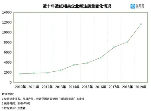 随着近年来塑料禁令等政策的实施,与纸张相关的公司的新注册数量在2016年之后迅速增加。根据该公司的数据,2019年有12,000家新注册的公司,同比同比增长43.67%。