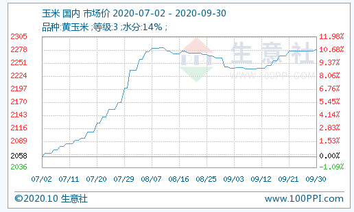 据生意社监,9月国内玉米价格小幅偏强运行,9月1日3等黄玉米均价为2244.29元/吨,9月30日均价为2280.00元/吨,小幅上涨1.59%。