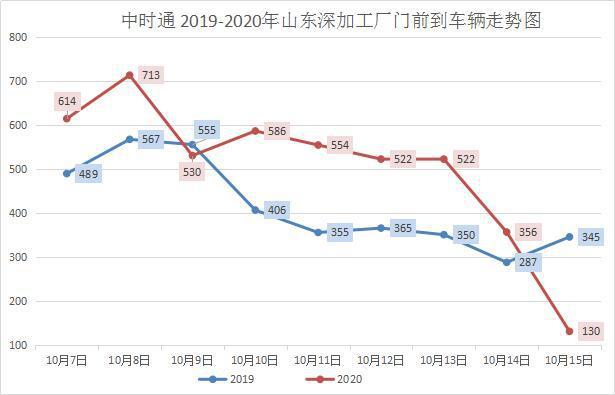今天山东地区加工企业到厂车辆大幅度下滑,再度回到了低迷状态,总到厂车辆130辆,较昨日减少226辆,减少原因一方面是因为近期的阴雨天气又开始了,山东地区、东北地区多多少少都有降雨,另一方面也是天气原因,10月13号东北黑龙江地区迎来了一场降雪,给玉米收割再次加大难度,为了防止天气持续恶化下去,大部分农户开始抓紧时间抢收玉米,停下了出粮的步伐。