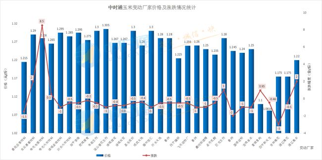 通过数据监测可以看出今日玉米市场较为震荡,深加工厂降价较多部分补涨,跌幅多在2厘-3分不等,跨度相对较大,目前超过1.3元的厂家仅剩济宁的米能、百盛、菱花,枣庄的恒仁、信德,潍坊的昌乐英轩了,落价势头依旧较猛。补涨的厂家也有几家,今日河南巨龙生物回调1分,价格1.28元/斤;黑龙江富锦象屿上调9.5厘,价格1.1元/斤;通辽集丰上调2分,价格1.22元/斤。饲料厂相对优质优价,降价没有那么明显,涨跌互现,部分下跌在5厘-1.5分,上涨幅度不等,最高达8.5分。