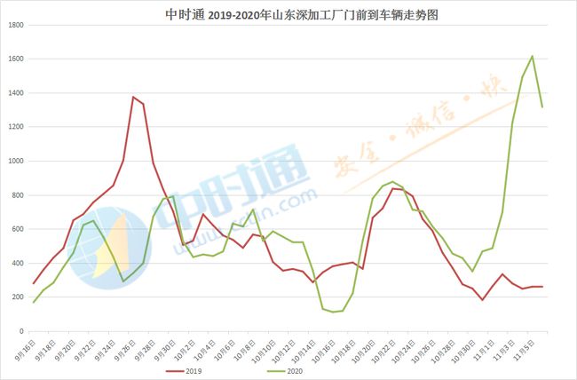 今日山东深加工厂门前到车辆略有减少,目前1316辆,减少298辆,到车最多的是诸城兴贸185辆,再跌8厘,价格1.267元/斤;第二位是滕州恒仁158辆,今日跌1分,价格1.3元/斤;第三位肥城福宽100辆,今日跌2厘,价格1.275元/斤,其他厂家暂未破百。今日到货量开始减少,市面上依旧是潮粮流通较多,从下图可以看出今年的上量高峰虽然来得比去年晚了一些,但是势头更猛,到车辆已打破去年上量后的峰值。