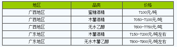 广西糖蜜酒精报7100元/吨;广西木薯酒精报价7050-7100元/吨;无水乙醇价格7600-7750元/吨。广西地区95%乙醇市场坚挺,企业报价高位,企业订单出货,广西地区无水乙醇市场上行,企业报价拉涨,库存低位。