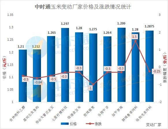 通过中时通数据监测可以看出今日玉米市场整体依旧偏弱运行!国内深加工厂方面变动厂家均为落价,山东、河北、东北地区均有落价,整体来看下调幅度依旧不大,在2厘-1分内,肥城福宽今日下跌幅度目前最大,下调1分,价格执行1.275元/斤。山东饲料厂方面今日涨跌互现,聊城鲁莘饲料涨1.5分,价格执行1.28元/斤,临朐龙泉饲料下调2.5厘,价格系1.2875元/斤。