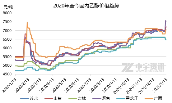河南优级乙醇上周五至今已连续上涨420元左右。不仅河南,山东、江苏等地也都跟随上移,截止目前,国内无水乙醇基本已突破8000元/吨大关,国内乙醇行情就像坐上了火箭,涨幅越来越夸张。贸易商方面也多方询价,然而持货商迫于原料不足难以大量生产,国内装置开工普遍不高,工厂门前排队提货车辆太多,厂家普遍不愿签订新单,造成了有价无市的市场怪圈。