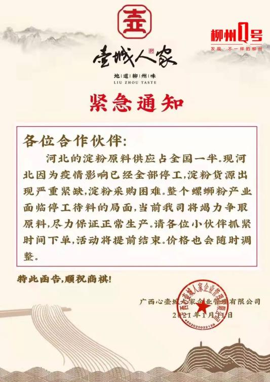 这则通知是1月11日,由广西心壶城人家企业管理有限公司发出的。该企业总经理助理郑祚透露,淀粉供应主要来自北方,因生产制作工艺所需,淀粉紧缺企业受掣肘。