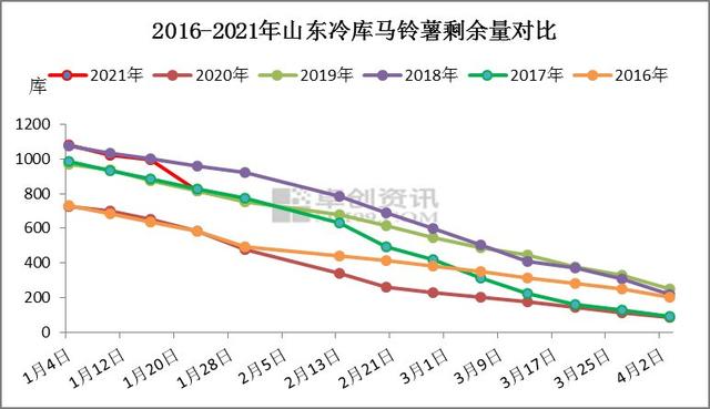 从上表可以看出,截至1月底,山东冷库马铃薯库存剩余库数参考757库,较2020年同期剩余库数增加280库,增幅参考58.70%。从上图可以看出,1月1日-2月3日时间段内,2021年山东冷库马铃薯库余量仅低于2018年同期库余量,却高于2016年、2017年、2019年、2020年四年同期库余量,基本处于近6年以来同期库余量第二高位。