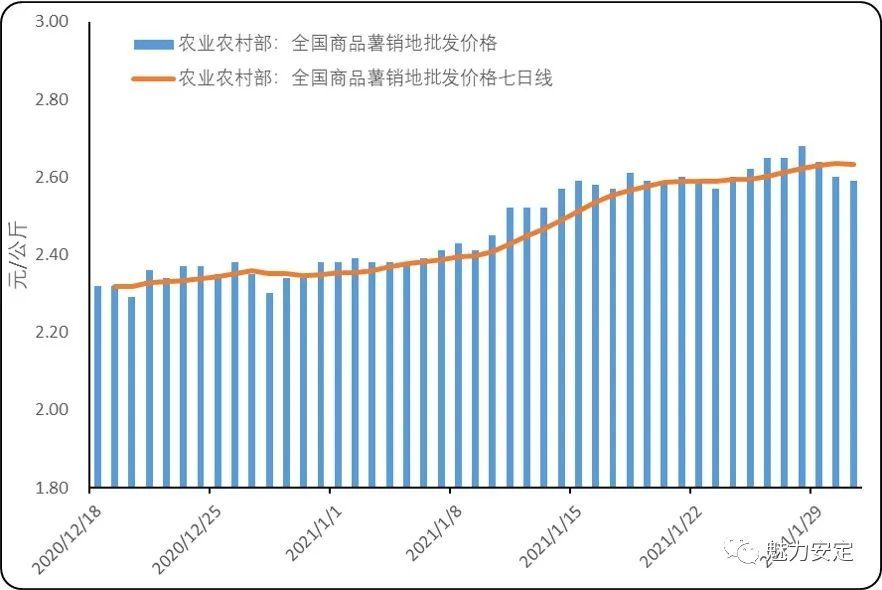 在全国蔬菜价格连续攀涨的带动下,全国商品薯销地批发价格亦呈现持续回暖态势。截至1月31日,全国商品薯周度销地批发均价报2.63元/公斤,月度环比累计上涨12.10%,低于全国蔬菜批发价格同期涨幅。从周度均价涨幅来看,1月29日当周全国马铃薯涨幅首次超过同期全国蔬菜涨幅。