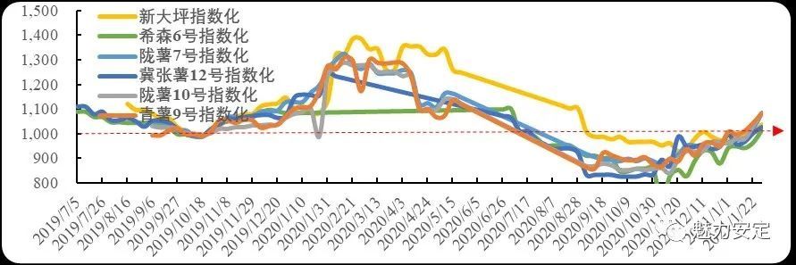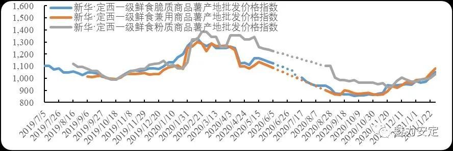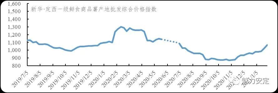 本期国内居家消费增多,叠加寒潮频袭影响,全国蔬菜销地批发价格呈现持续较大幅度上涨,带动全国商品薯市场价格呈现连续上涨走势。同时,在不同因素影响下东北、华北、内蒙古等地区窖藏薯出货不足,西北地区商品薯产地销售量价齐增,定西商品薯产地批发价格亦呈现连续上涨走势。截至2021年1月29日,新华·定西一级鲜食商品薯产地批发综合价格指数报1067.47点,环比上涨4.17%,自元旦以来累计上涨8.94%。
