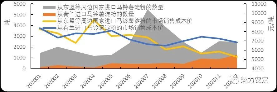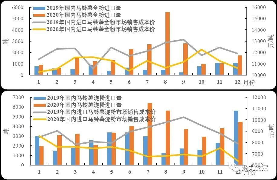 2020年国内马铃薯淀粉和全粉的进口量均出现大幅上涨,进口均价出现下跌。截至12月底,2020年国内马铃薯全粉进口总量达22769吨,较上一年上涨187.63%;2020年进口马铃薯淀粉在国内市场销售成本均价为7152元/吨,较上一年度下跌17.09%。从欧盟委员会官网获悉,受疫情影响,产地出货不畅,加工型商品薯成交价格处于低位,不足上一年度的一半,春节后国内市场或将承压。