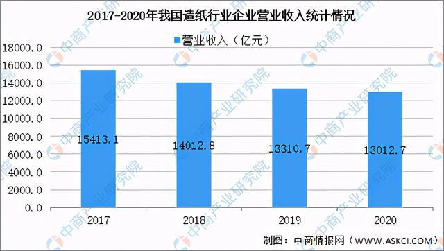 根据中商产业研究院监测数据显示,2020年中国造纸企业营业收入持续下降,营业收入为13012.7亿元,同比下降2.2%。虽然,不少造纸企业因环保而破产,但是中国造纸企业集中度提升,预计未来大型造纸企业业务营收增长,从而带动整个行业主营业务营收攀升。