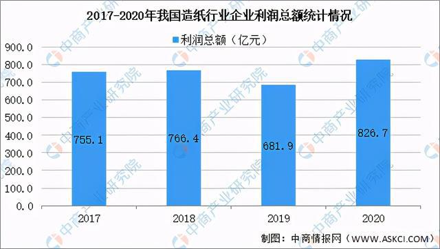 2020年中国造纸企业利润较2019年有所上升,造纸企业利润总额由2019年681.9亿元降至2020年的826.7亿元,涨幅21.2%。