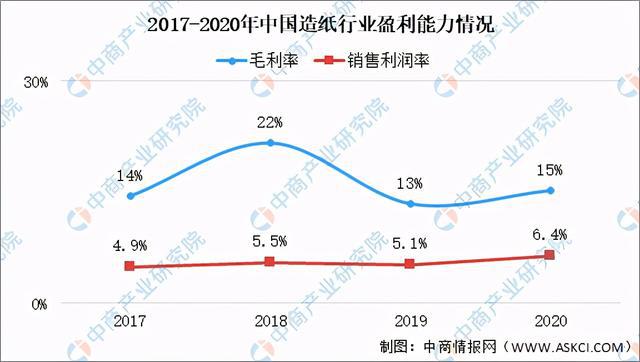 近年来,我国造纸行业盈利能力呈现提高的趋势,2020年毛利率为15%,销售利润率由2017年的4.9%提高至2020年的6.4%。