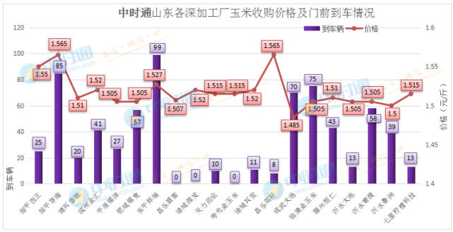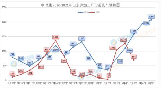 今日山东深加工厂门前到车辆694辆!较昨日减少582辆!